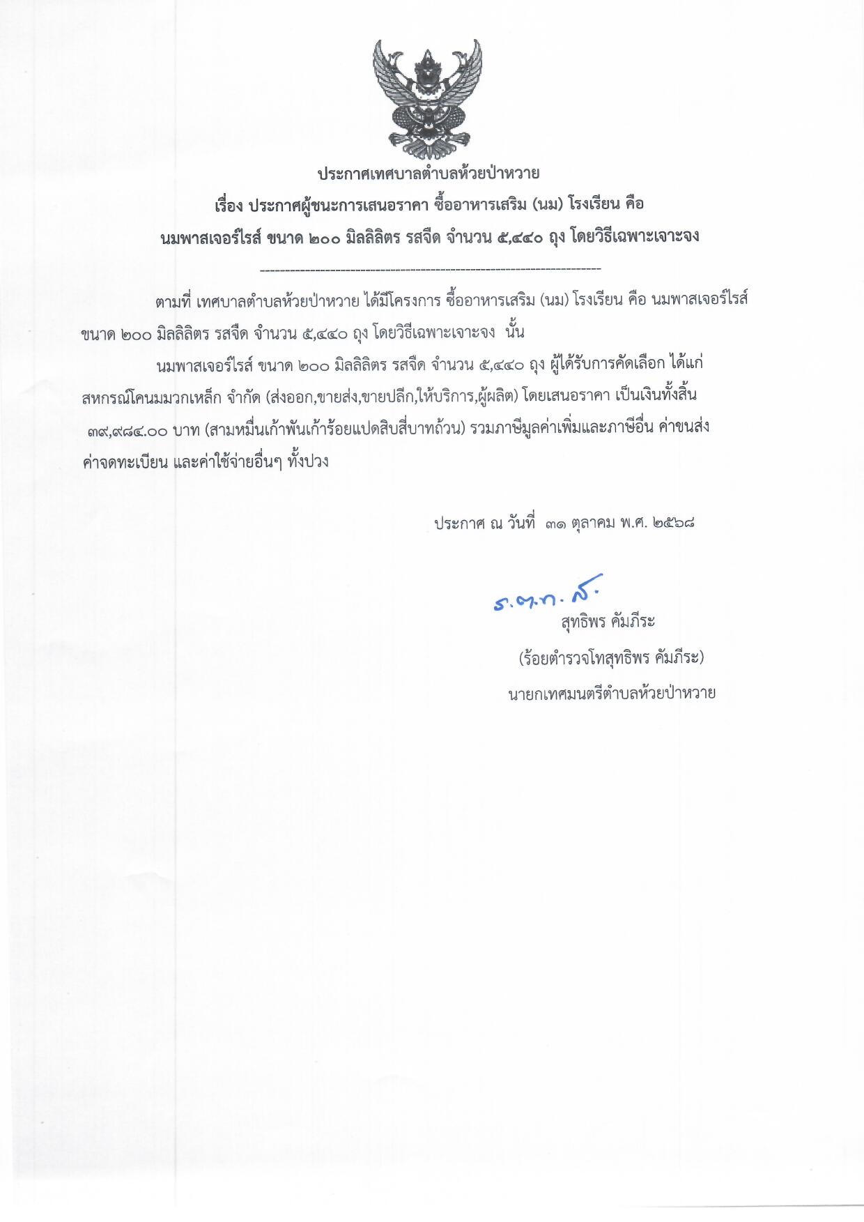 ประกาศเทศบาลตำบลห้วยป่าหวาย เรื่อง ประกาศผู้ชนะการเสนอราคา ซื้ออาหารเสริม (นม) โรงเรียน คือ นมพาสเจอร์ไรส์ ขนาด ๒๐๐ มิลลิลิตร รสจืด จำนวน ๕,๔๔๐ ถุง โดยวิธีเฉพาะเจาะจง