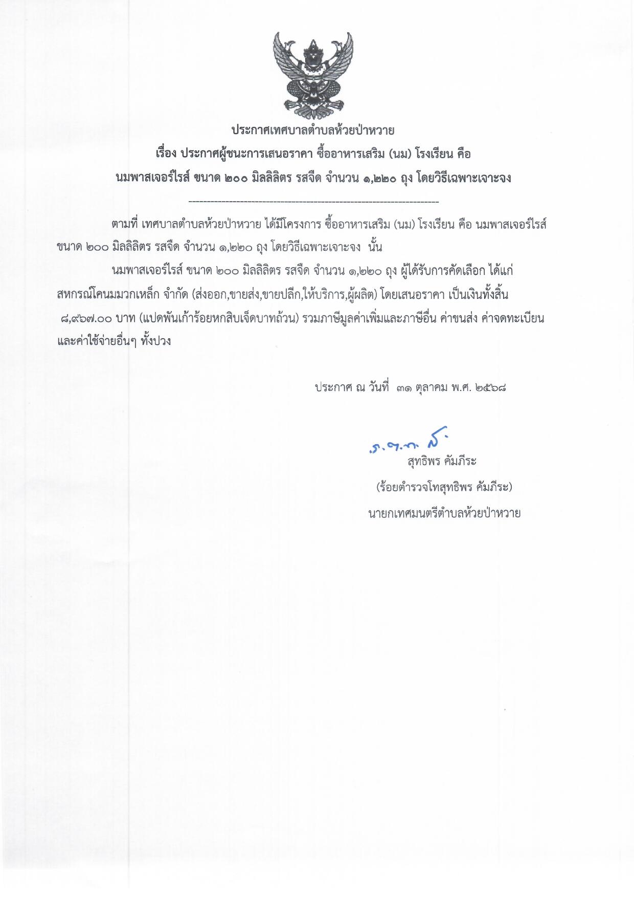 ประกาศเทศบาลตำบลห้วยป่าหวาย เรื่อง ประกาศผู้ชนะการเสนอราคา ซื้ออาหารเสริม (นม) โรงเรียน คือ นมพาสเจอร์ไรส์ ขนาด ๒๐๐ มิลลิลิตร รสจืด จำนวน ๑,๒๒๐ ถุง โดยวิธีเฉพาะเจาะจง